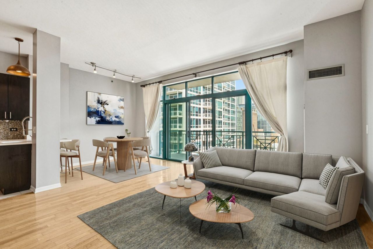 Now is your chance to own a piece of the Chicago skyline! This remarkable 1 BD+den condo located in one of the most highly sought after buildings in River North. Enjoy breathtaking skyline views from your living room, kitchen, and massive east facing balcony. Open concept kitchen boasts espresso shaker cabinets quartz countertops, custom backsplash, breakfast bar, and SS appliance package. Gleaming hardwood floors throughout the living room/foyer, floor to ceiling windows bringing in an abundance of natural light, and ample storage throughout. The versatile den space is perfect for an at home office or lounge area. In unit washer/dryer perfectly tucked away by a stylish barn door. Situated in a full amenity building with 24HR door staff, rooftop sundeck, expansive exercise room with city views, dry cleaners and Galleria Market. Assessments include heat, A/C, gas, cable & internet. Walk to restaurants, shopping, East Bank Club, Montgomery Ward Park, and Michigan Ave. Pet and investor friendly. Located just a few blocks to 90/94, a block to Chicago Ave Brown line and Chicago Ave CTA bus makes this home a commuter's dream. Deeded, prime garage parking space and storage locker included in the price. Schedule your private tour today!